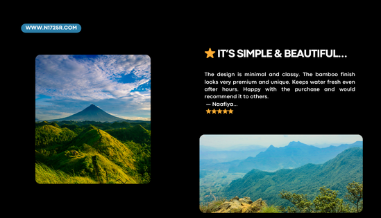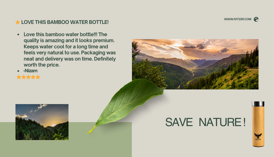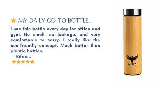 Welcome To N1725 Eco Friendly Store! Hydration. The Natural Way. Bamboo Water Bottles Reusable | Eco-Friendly | Plastic-Free Drink Clean. Live Green. N1725 Shop Our Eco Friendly Store... GO! Smart Eco Friendly bamboo water bottle… Buy Now N1725 Bamboo Stainless Steel Flask Water Bottle/Thermos with Tea Strainer | Double Wall Vacuum Insulated | Hot & Cold (450 ML)BrandN1725Capacity450 MillilitersColourNatural Wood ColorRecommended Uses For ProductCoffee, Tea, WaterSpecial FeatureAirtight, Microwave Safe Why Buy From Us Hello From N1725 Brand! See What Our Customers Have To Say... Click Here to Read More Customer Reviews... A Few Of Our Happy Customers! 👉 “Chemical-Free • Eco-Friendly • Perfect for Daily Use”